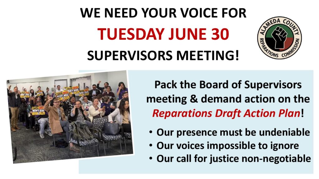 - 15 member Reparations Commission is established to create an action plan addressing inequities faced by African Americans in Alameda County